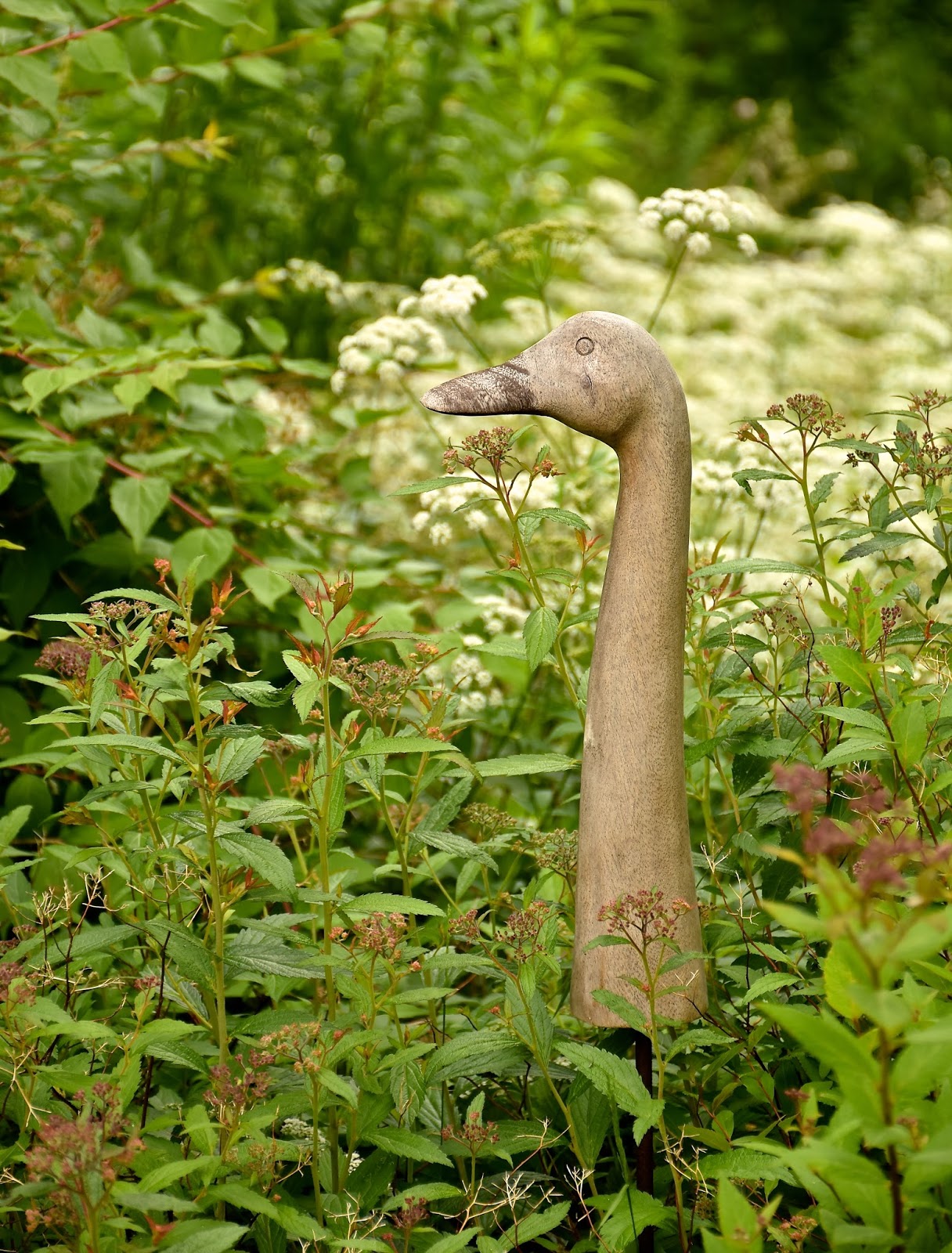 Jag är fortfarande lite kär i gåsakarlen i trä som jag hittade på Malmö Garden Show förra året. Han är ju sååå stilig! I år har han fått slå läger i rosenspireabusken nära huset, så att jag kan säga hej till honom på väg upp och ner för kökstrappan.