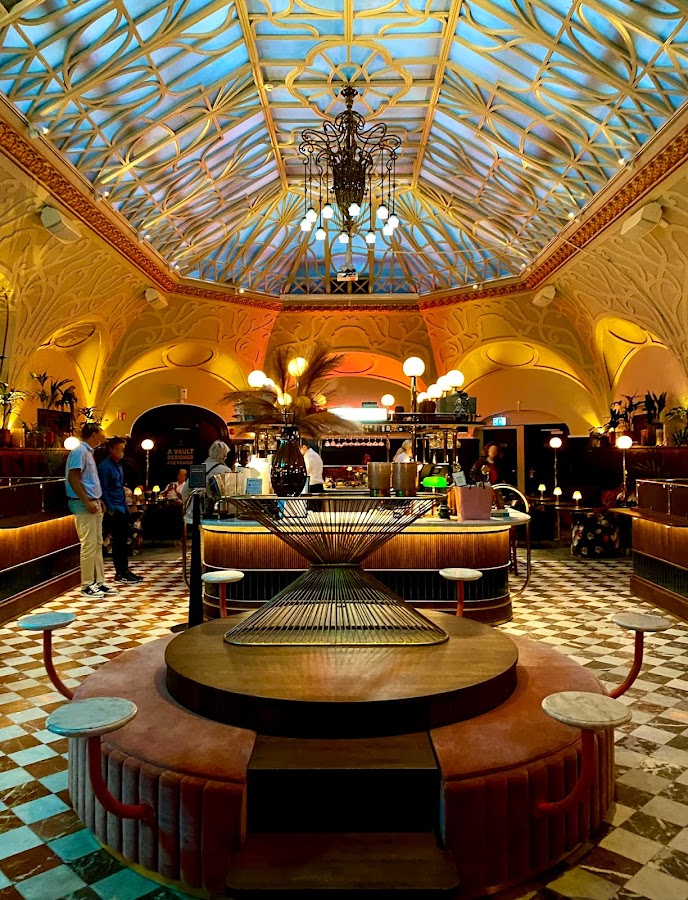 Sent på eftermiddagen gick vi ner och satte oss i baren en stund. Det är ändå en speciell atmosfär på hotell, och här förstärktes den känslan onekligen ännu mer. Så coolt med baren mitt i den stora gamla banksalen.