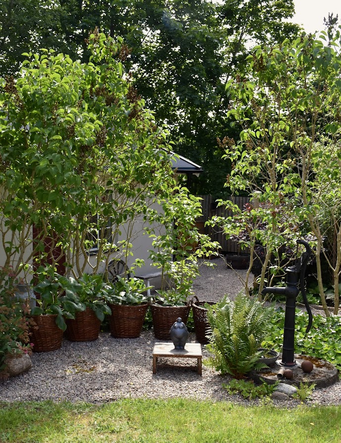 Fröken Proud har fått flytta till det lilla lågbordet vid pumpen. Här står hon nästan på första parkett, och jag blir glad varje gång jag går förbi och ser henne. I korgarna står flera av mina dahlior på tillväxt. De kom sent i jord, och det lär nog dröja ett bra tag till innan de blommar. Fast korgarna är ju fina som de är. Hittills i år kör jag på allt-som-är-samma-på-samma-ställe-devisen. Det är maffigt med masseffekt ändå. Och så underlättar det ju att allt står samlat när man ska vattna.